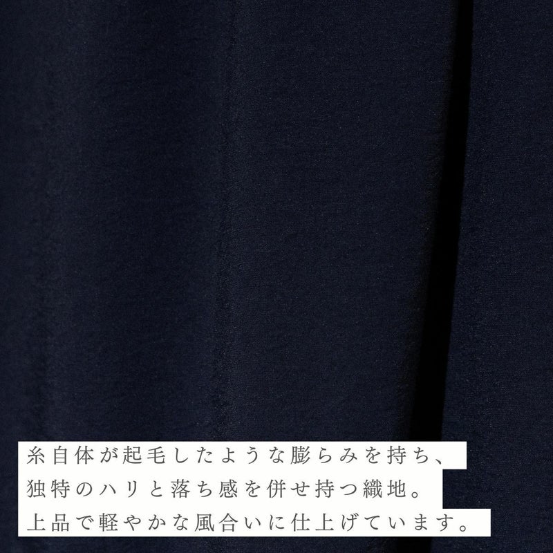 素材は糸自体が起毛したような膨らみを持ち、独特のハリと落ち感を併せ持つ織地で、上品で軽やかな風合いに仕上げています。