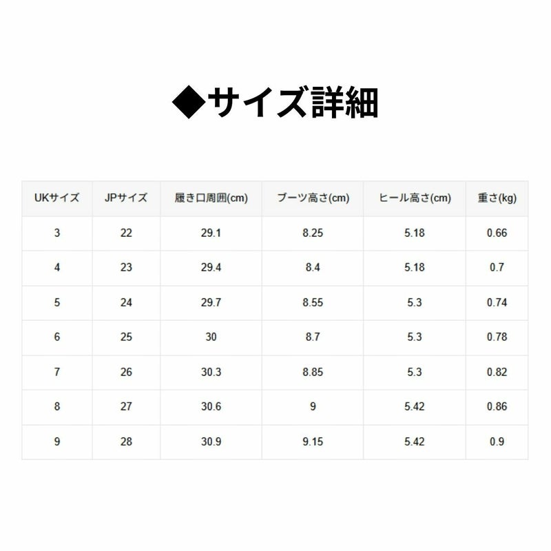 UK3/JP22 履き口周囲:29.1cm ブーツ高さ:8.25cm ヒール高さ:5.18cm 重さ:0.66kg