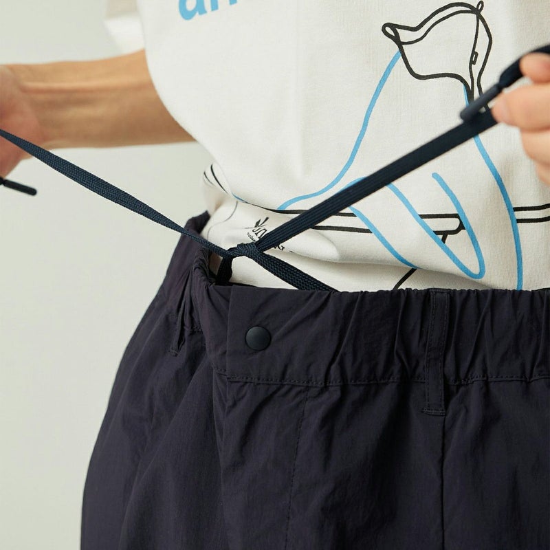 スピンドルコードで調整可能なゴムウエストで、着脱の容易なイージーパンツ型です。