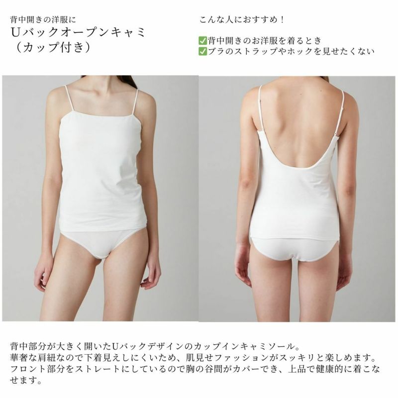 背中部分が大きく開いたUバックデザインが特徴のカップインキャミソール。