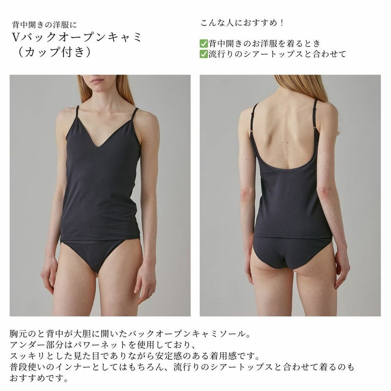 胸元のと背中が大胆に開いたバックオープンキャミソール。