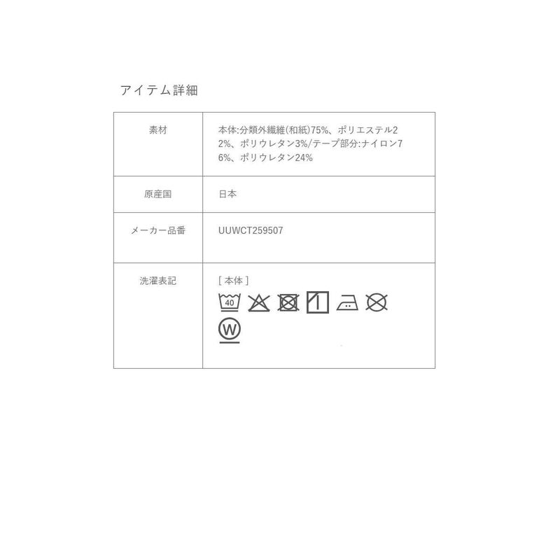 本体:分類外繊維(和紙)75%、ポリエステル22%、ポリウレタン3%/テープ部分:ナイロン76%、ポリウレタン24%