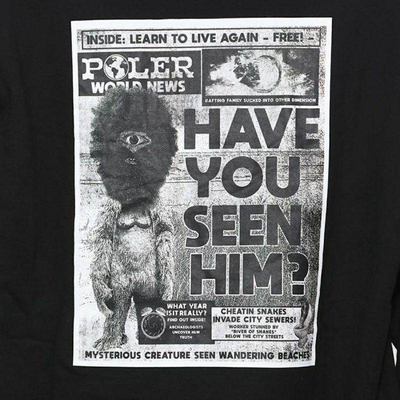 未知のクリーチャーを記録した雑誌の切り抜きを思わせるグラフィックがフロントにプリントされたスウェットフーディ。