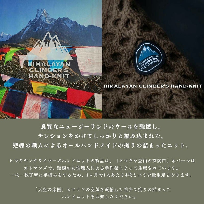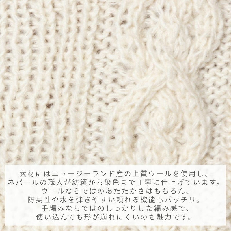 ウ-ル本来の着心地の良さと保温性の高さ、防臭効果に加え表面は水分を弾く機能性に優れています。原毛は上質なニュ-ジ-ランドから輸入し、ヒマラヤ(ネパ-ル)で紡績・染色しています。職人が数種類の太さの棒針とかぎ針を巧みに使い高い技術で手編みしています。よって機械では出来ない凹凸感や仕上がり感を表現しています。