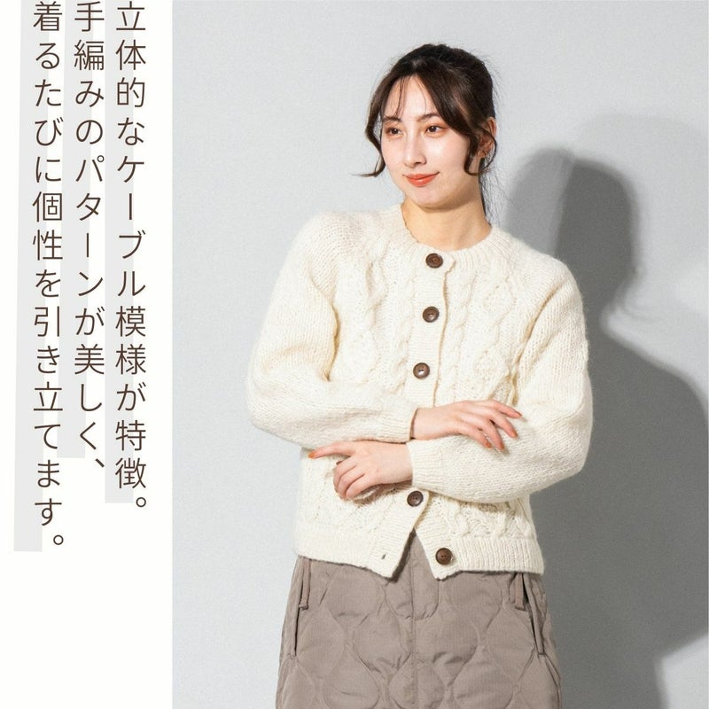 ハンドメイドの温かみを感じられるこのクルーカ-ディガンは独特なデザインと色使いで他と一線を画します。特に強調すべきは、程よいフィット感のクルー衿、水牛の角から削り出したボタン、立体感・膨らみのあるケーブル編み、落ち着いたナチュラルな色目が挙げられます。