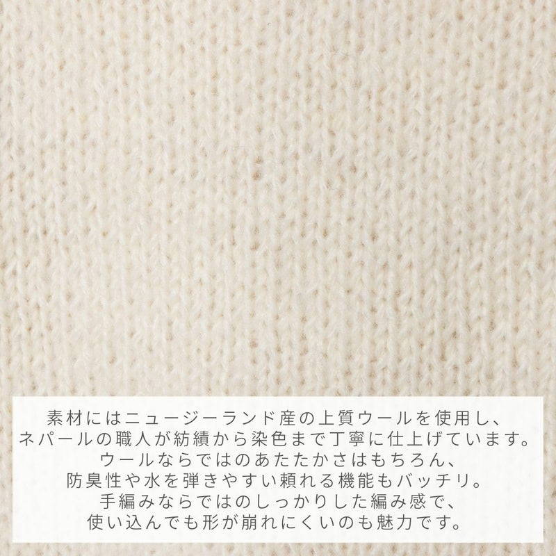 ウ-ル本来の着心地の良さと保温性の高さ、防臭効果に加え表面は水分を弾く機能性に優れています。原毛は上質なニュ-ジ-ランドから輸入し、ヒマラヤ(ネパ-ル)で紡績・染色しています。職人が数種類の太さの棒針とかぎ針を巧みに使い高い技術で手編みしています。よって機械では出来ない凹凸感や仕上がり感を表現しています。