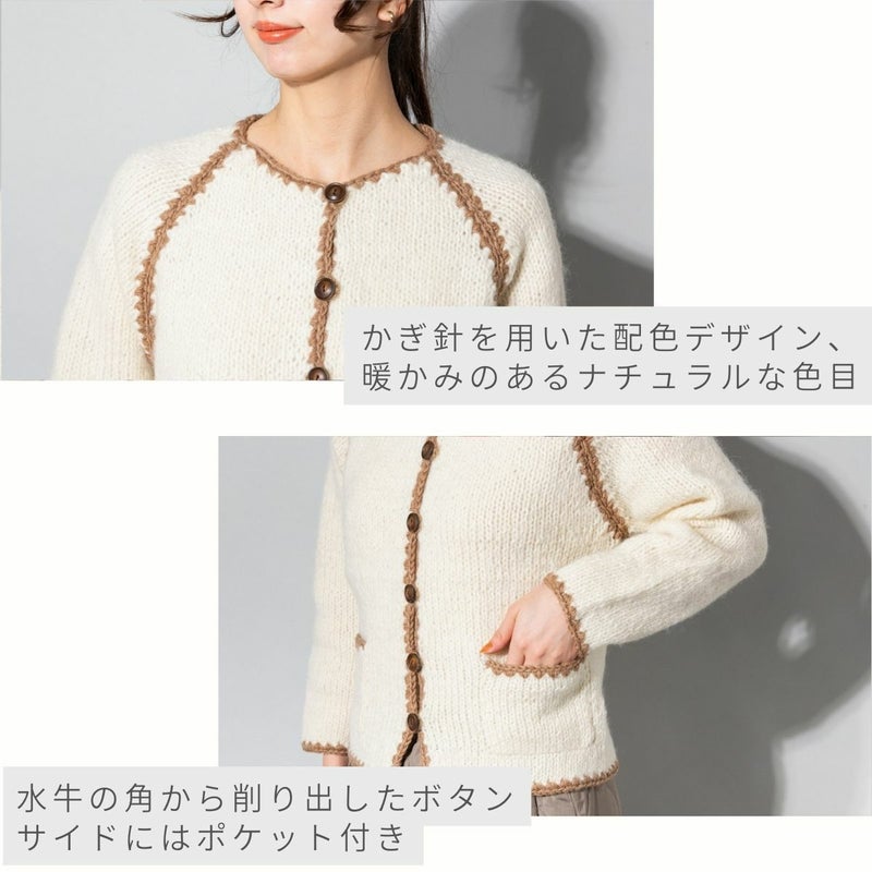 ハンドメイドの温かみを感じられるこのクルーカ-ディガンは独特なデザインで他と一線を画します。特に強調すべきは、程よいフィット感のクルー衿、水牛の角から削り出したボタン、かぎ針を用いた配色デザイン、暖かみのあるナチュラルな色目が挙げられます。