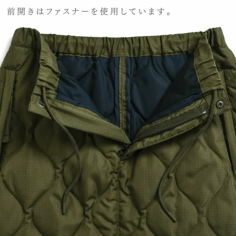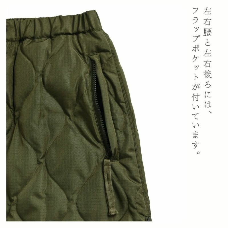 スパッツやパンツとの重ね着もお勧めな、暖かく履き応えのある、ミリタリーテイストのダウンスカートです。