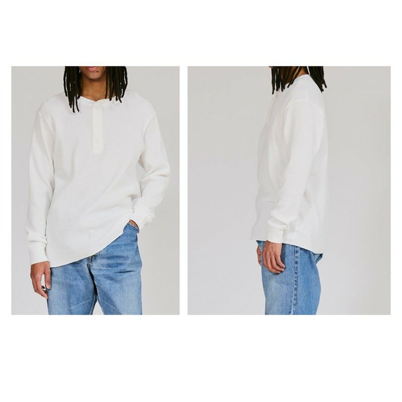 オープンエンド糸で編み立てたワッフル素材のサーマルトップ ヘンリーネックロングスリーブです。
