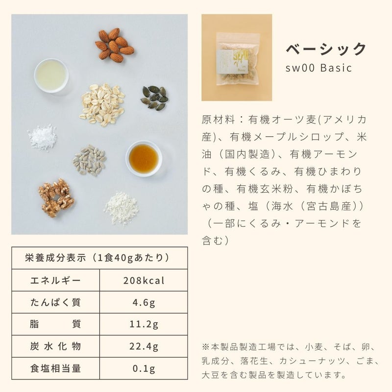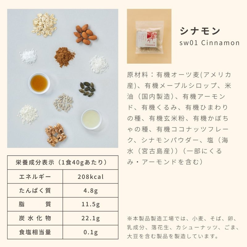 原材材料:有機オーツ麦(アメリカ産)、有機メープルシロップ、米油(国内製造)、有機アーモンド、