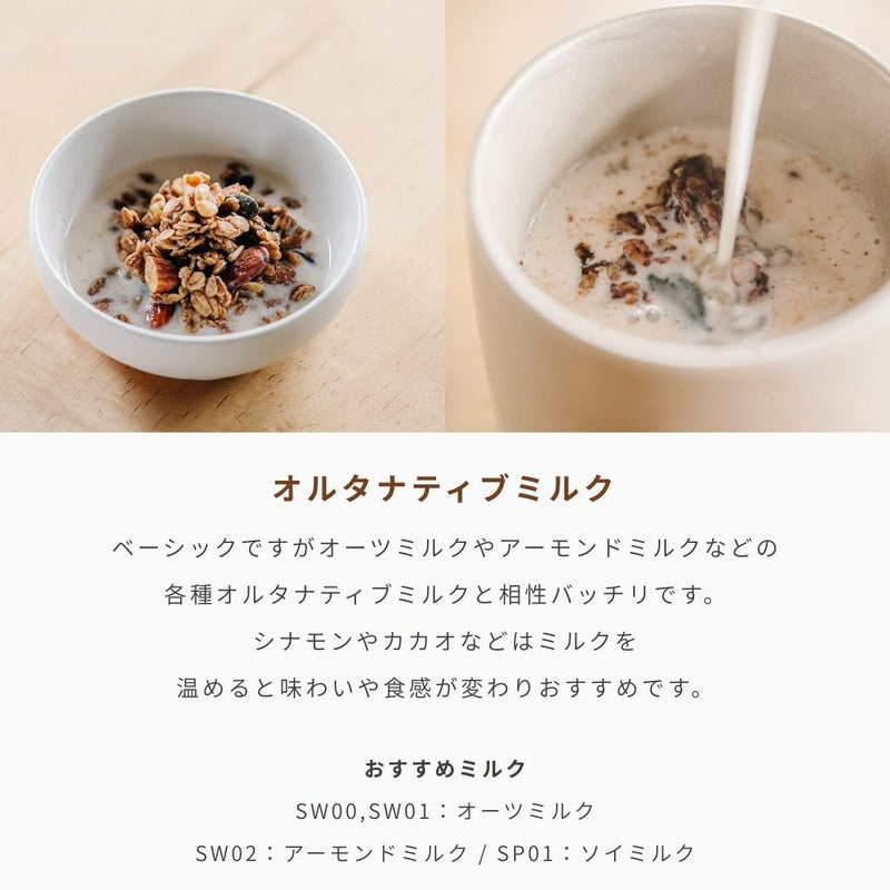 主要な素材であるオーツ麦は食物繊維やミネラル、ビタミンB類が豊富で、その他のナッツ、米油、塩など、