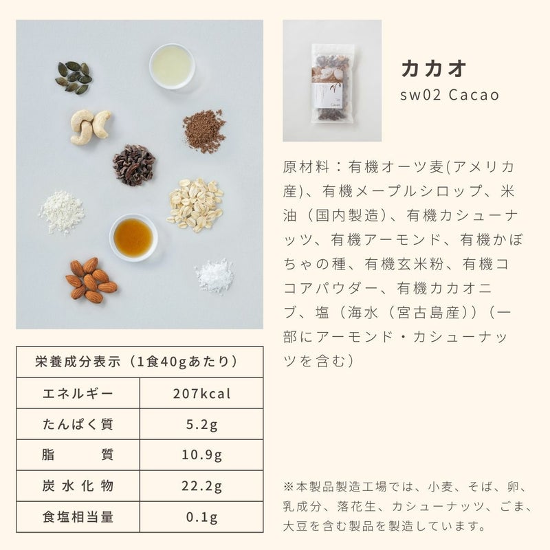 有機カシューナッツ、有機アーモンド、有機かぼちゃの種、有機玄米粉、有機ココアパウダー、