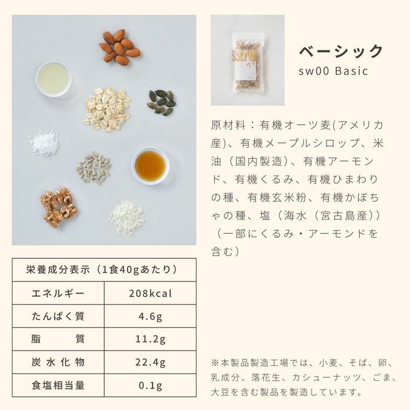 原材材料:有機オーツ麦(アメリカ産)、有機メープルシロップ、米油(国内製造)、有機アーモンド、
