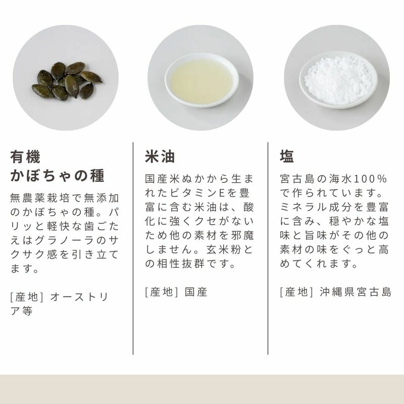 有機玄米粉、有機ひまわりの種、有機かぼちゃの種、有機黒胡麻、塩(海水(宮古島産))