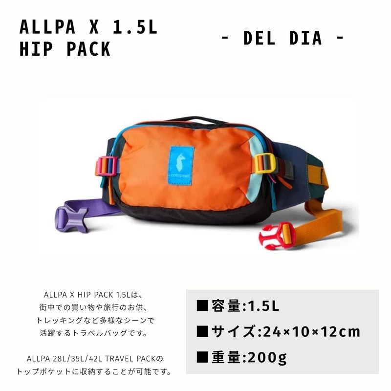 Allpaコレクションで展開されているスタンダードなカラー展開のAllpa X Hip Pack 1.5Lと機能面は同じですが、このDel Diaコレクションバージョンは廃棄処分される予定だった上質なデッドストック生地を使用しているため、1つ1つのパックが世界に1つだけのものとなっています。