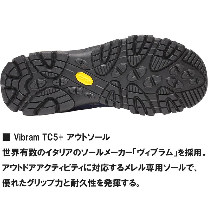 アウトドアアクティビティに対応するメレル専用ソールで、優れたグリップ力と耐久性を発揮する。