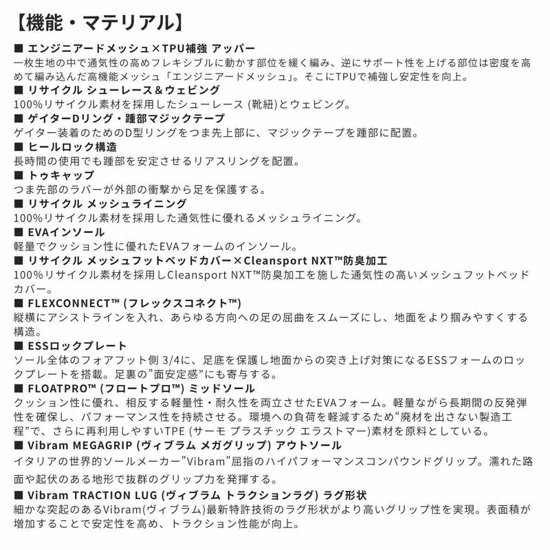 アッパーには、軽量で通気性に優れた「高機能エンジニアードメッシュ×TPU補強」を採用し、