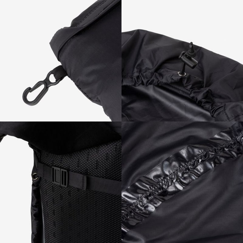 背面にドローコードとズレにくくするための固定用ストラップを装備し、携行に便利なパッカブル仕様です。