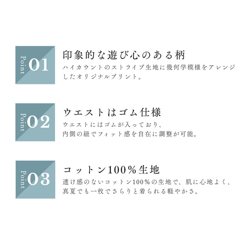 ハイカウントのストライプ生地にオリジナルプリントを施したパンツ。