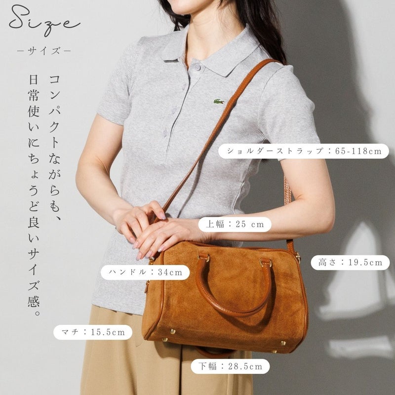 縦:19.5cm 上横:25 cm 下幅:28.5cm マチ:15.5cm ハンドル:34cm ストラップ:65-118cm