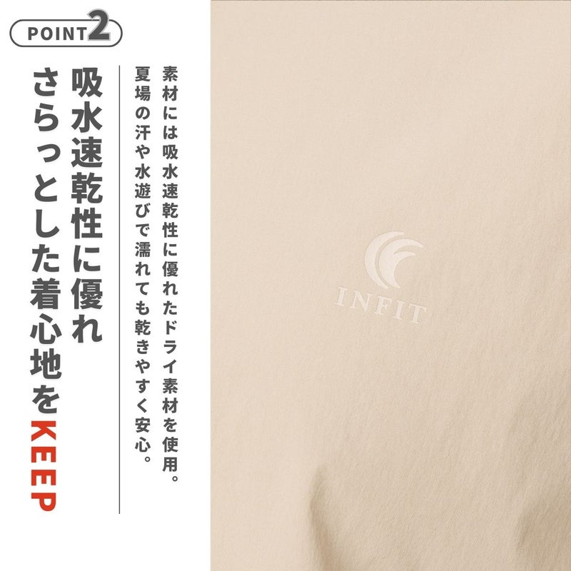 素材には吸水速乾性に優れたドライ素材を使用。汗をかいても乾きやすく、暑い季節でもさらっと快適に着用できます。