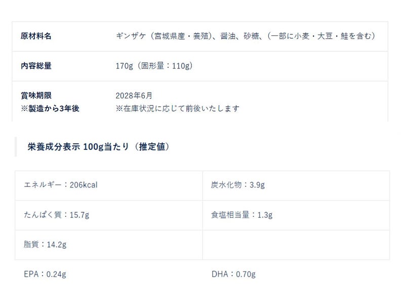 ギンザケ(宮城県産・養殖)、醤油、砂糖、(一部に小麦・大豆・鮭を含む)