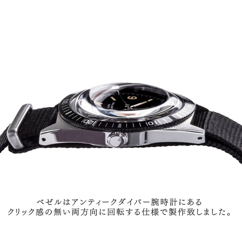 ケース及びケースバック素材は316Lステンレススティールを使用。ベゼルはアンティークダイバー腕時計にあるクリック感の無い両方向に回転する仕様で製作致しました。