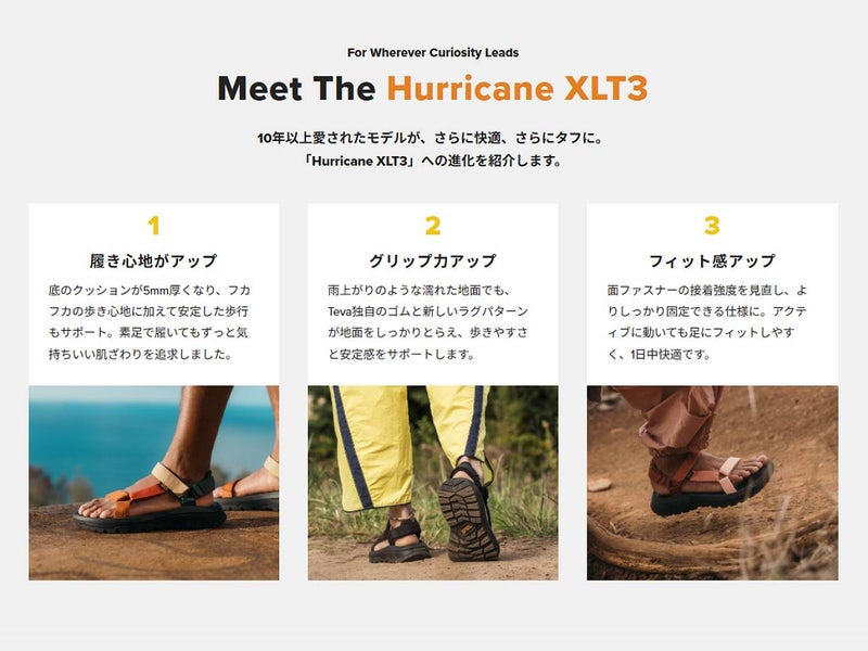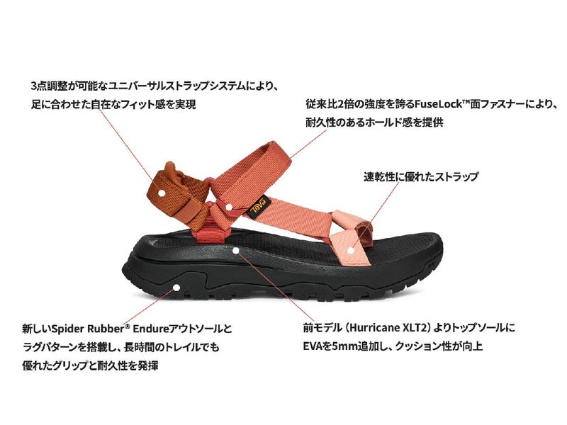 アイコニックな Hurricane XLT2が、最新テクノロジーをまとって進化。アドベンチャーに対応する機能性をさらに高め、柔らかいテクスチャーを施したトップソールが、足裏に快適なフィット感を提供します。速乾性に優れたストラップ、かかとを支えるパッド、調整が簡単なユニバーサルストラップシステムなど、Hurricane XLT2で長く愛されてきた仕様はそのままに、より快適で、より冒険に強い一足へとアップグレードされました。