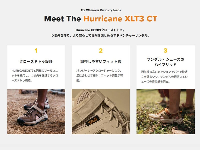 最新モデルHurricane XLT3をクローズドトゥ仕様にアレンジしたHurricane XLT3 CTは、毎日のどんな冒険にも対応できるパートナーです。耐久性と、さまざまな地形に対応する優れたグリップ力を備えています。速乾性メッシュのアッパーとバンジーレース、凹凸のあるラグパターンが、冒険に必要とされる快適なフィット感と安定した歩行をサポートします。