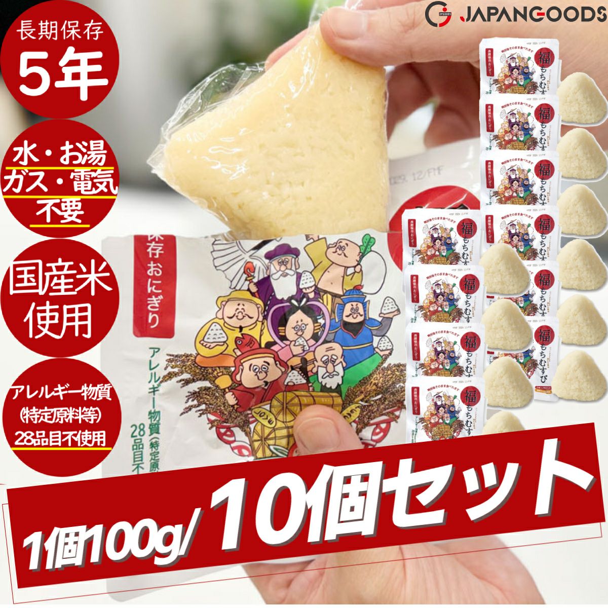 登山 アウトドア トレイル 小物 【10個セット!】ジャパングッズ JAPANGOODS 福もちむすび 10個セット おむすび おにぎり 国産 日本製 国産米 5年間長期保存 水不要 お湯不要 電気不要 ガス不要 世界初 環境に優しい 災害 震災 遭難 レスキュー 非常食 保存食 防災食 防災アイテム 備蓄 キャンプ アウトドア