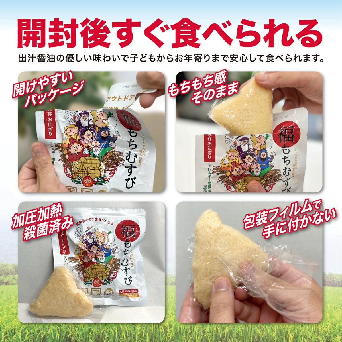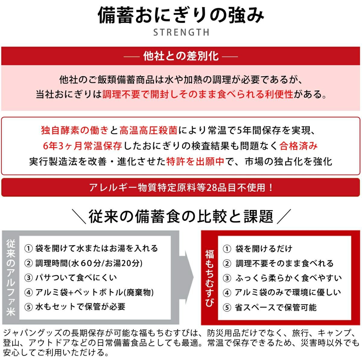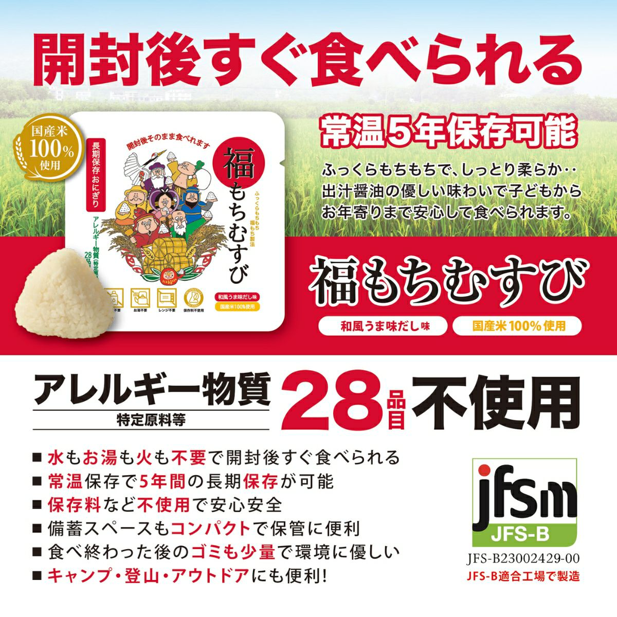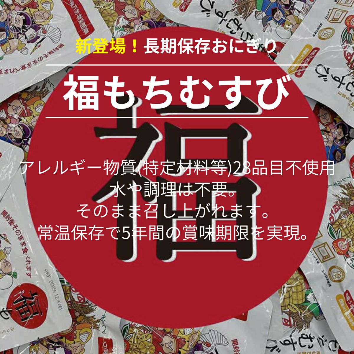 登山 アウトドア トレイル 小物 【5個セット!】ジャパングッズ JAPANGOODS 福もちむすび 5個セット おむすび おにぎり 国産 日本製 国産米 5年間長期保存 水不要 お湯不要 電気不要 ガス不要 世界初 環境に優しい 災害 震災 遭難 レスキュー 非常食 保存食 防災食 防災アイテム 備蓄 キャンプ アウトドア