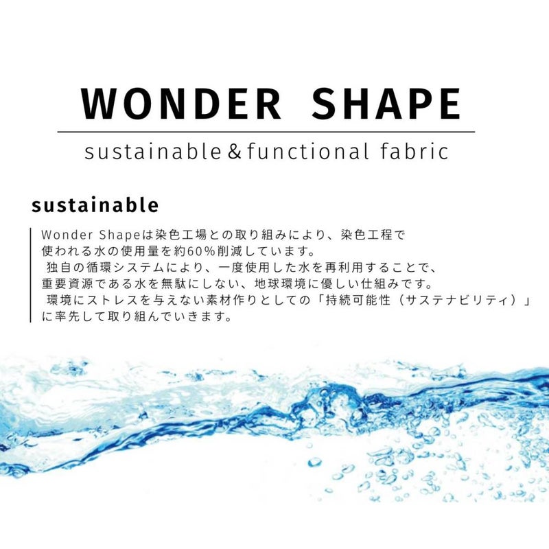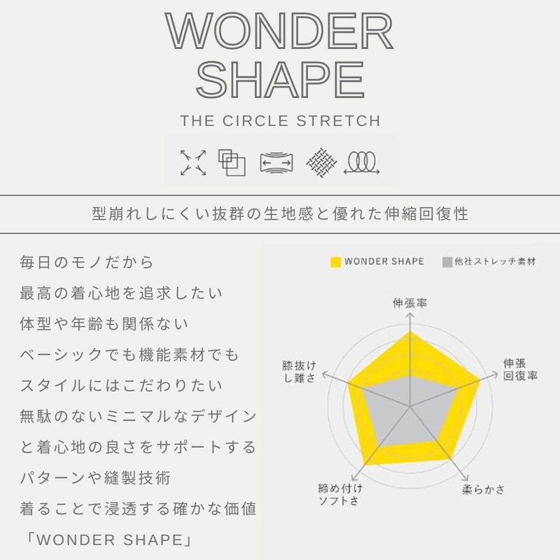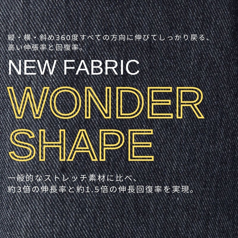 驚くほど伸びる「ワンダーシェイプ」素材を使用したデニムテーパードパンツ。縦・横・斜め360度すべての方向に伸びてしっかり戻る、高い伸張率と回復率を誇る次世代ファブリックです。一般的なストレッチ素材に比べ、約3倍の伸長率と約1.5倍の伸長回復率を実現。10%前後のポリウレタンを編み込むことで独特のハリ感があり、長時間穿いても型くずれや膝抜けしにくく、洗濯後もシワになりにくい安定した風合いを保ちます。