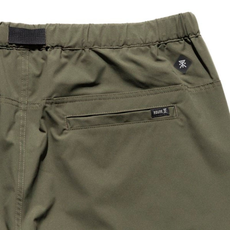 ウェービングベルトにはROARKのブランドアイコン、バックポケットにはブランドロゴがあしらわれています。