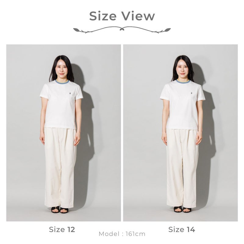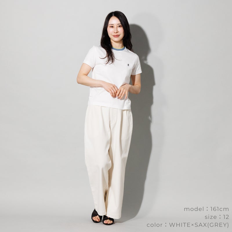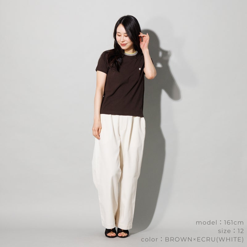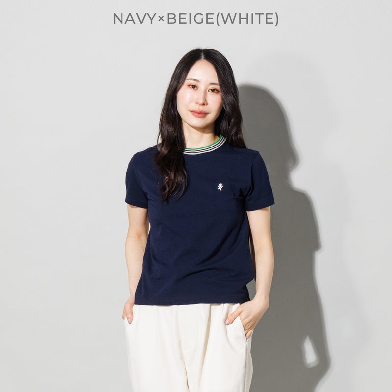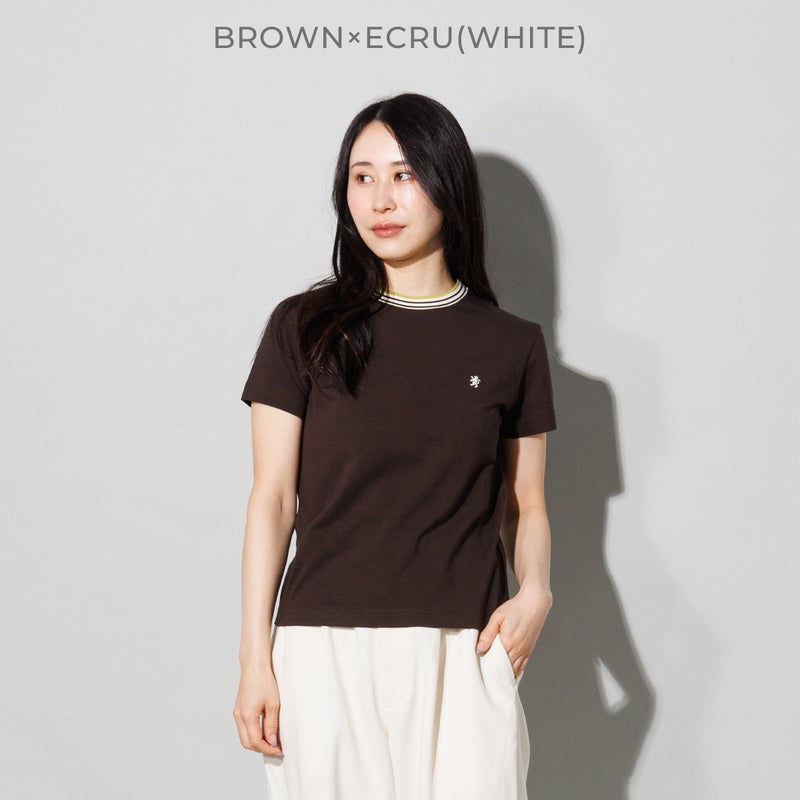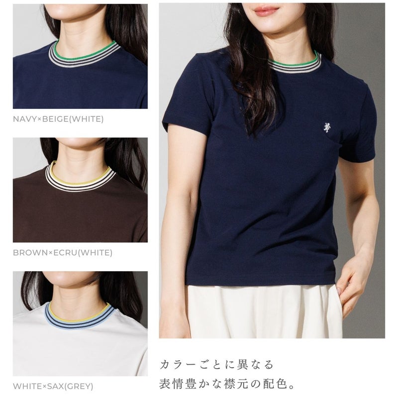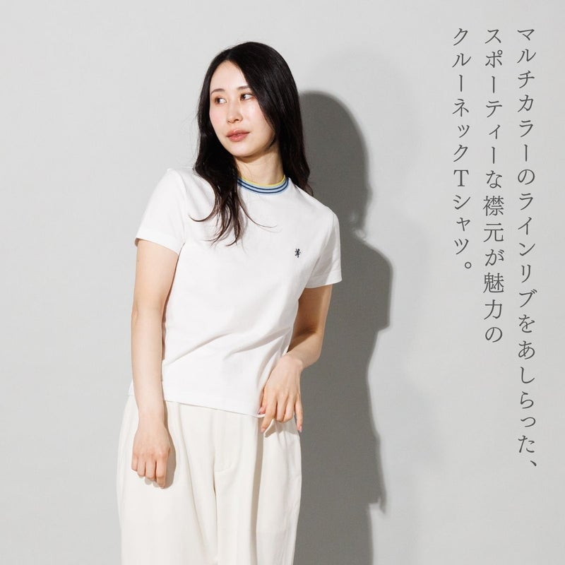 マルチカラーのラインリブをあしらった、スポーティーな襟元が魅力のクルーネックTシャツ。