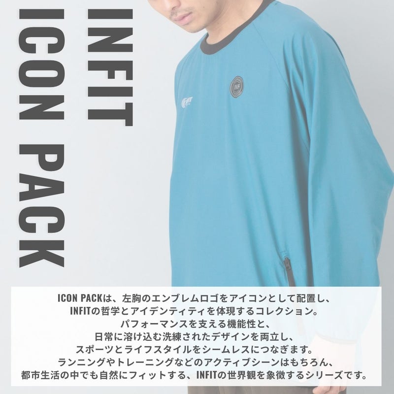 ICON PACKは、左胸のエンブレムロゴをアイコンとして配置し、INFITの哲学とアイデンティティを体現するコレクション。