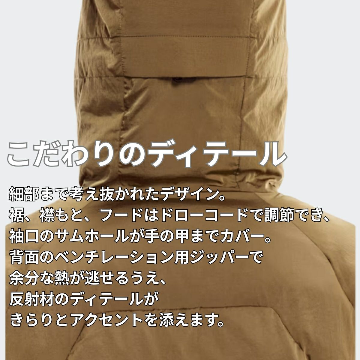裾、襟もと、フードはドローコードで調節でき、袖口のサムホールが手の甲までカバー。