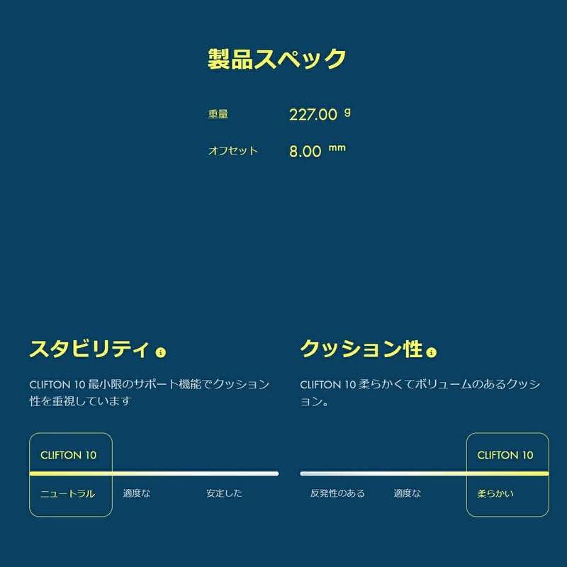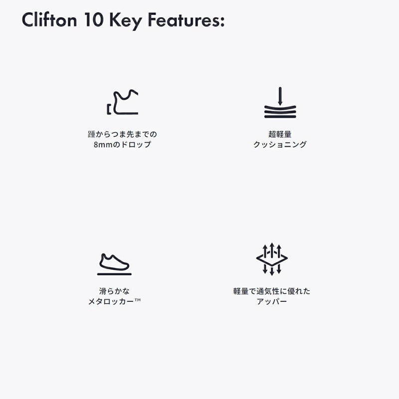 このクリフトンの次世代モデルのクリフトン 10(CLIFTON 10)は、かかとからつま先までのドロップを3mm高くすることでこれまでにない履き心地を提供します。