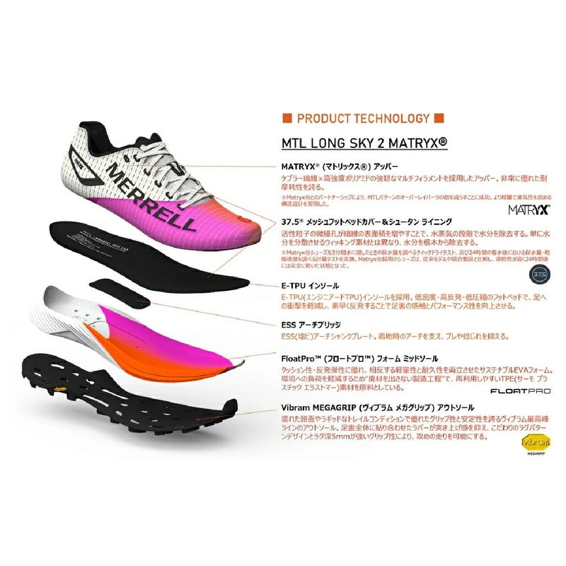 ブランドテクノロジーを結集させた”Merrell Test Lab. (メレルテストラボ)”発のフラッグシップライン。スピードレースやアップヒルなど短時間・短距離のトレイルレースで最大のパフォーマンスを発揮する超軽量×高機能トレイルランニングシューズ。