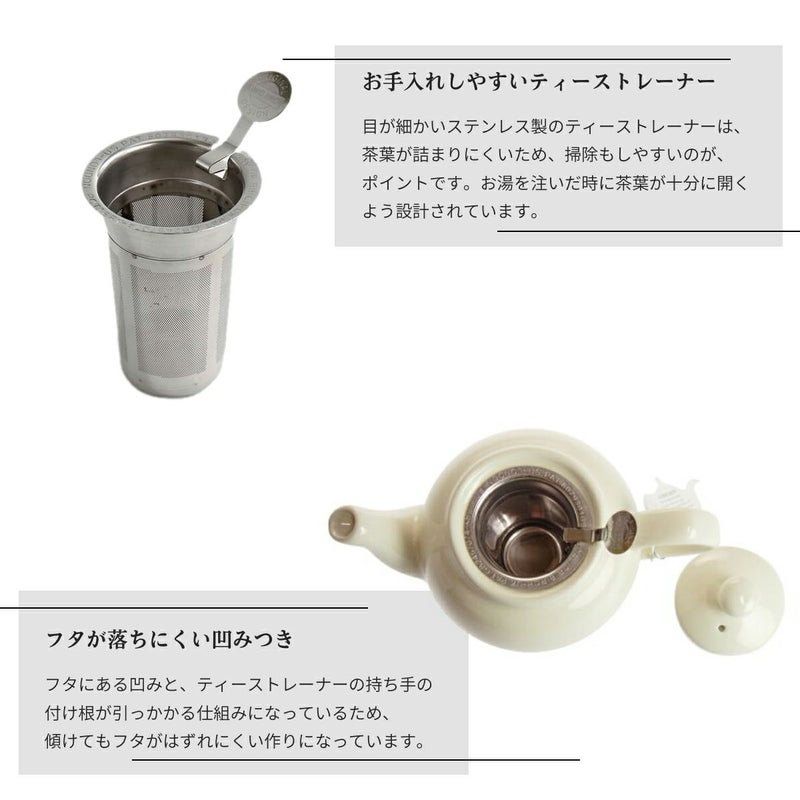 ・ティーストレーナーの目が細かいため、茶葉が詰まりづらくお手入れがしやすくなっております。