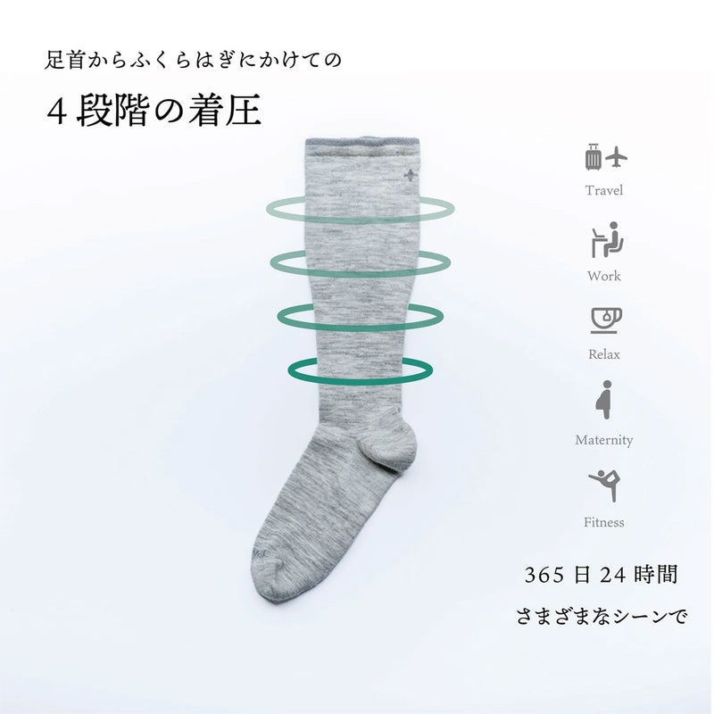足首からふくらはぎにかけての段階的着圧設計、シームレスなつま先、締め付けない履き口で、履いた瞬間から脱ぐ時まで窮屈さを感じさせません。