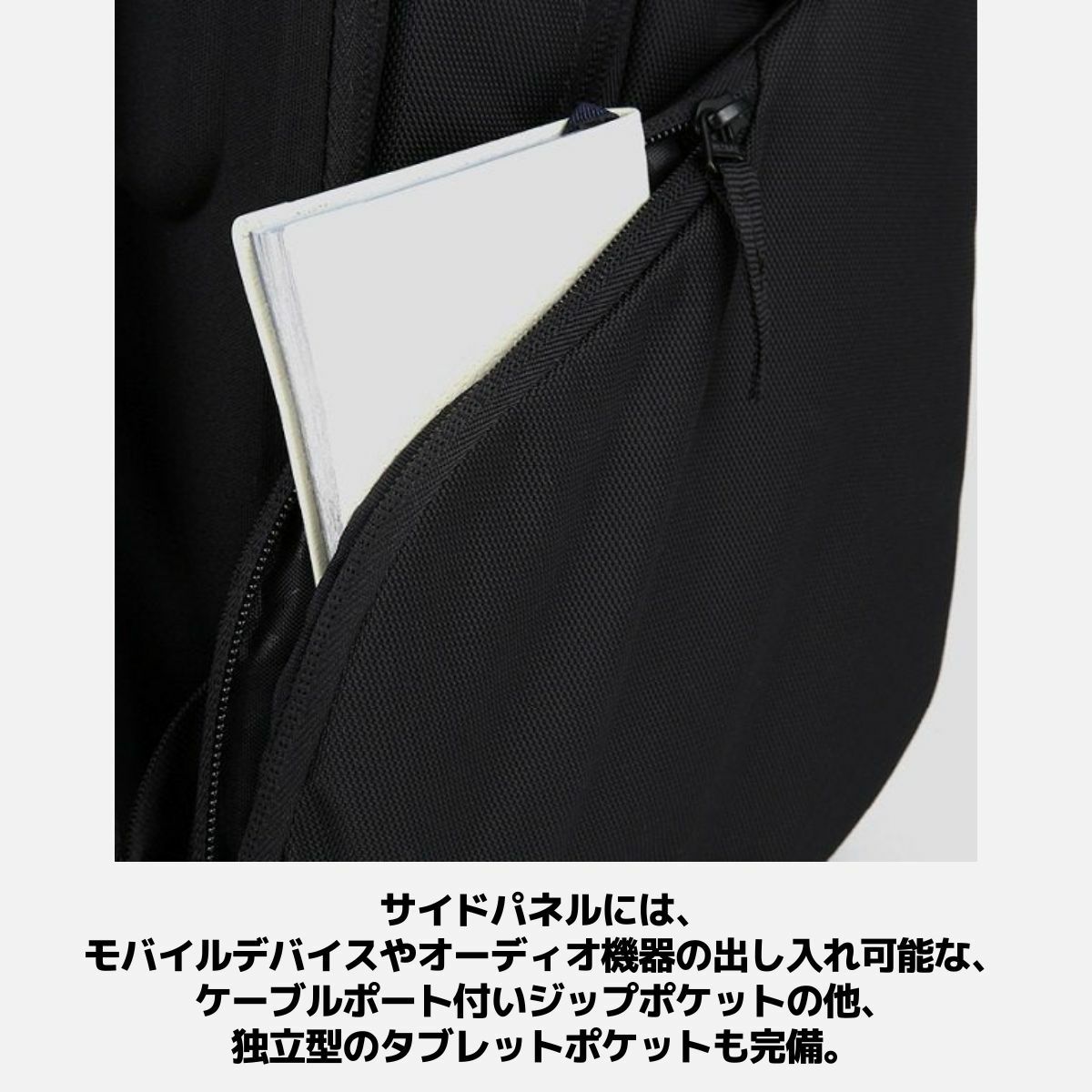 モバイルデバイスやオーディオ機器の出し入れ可能なケーブルポート付いジップポケットの他、