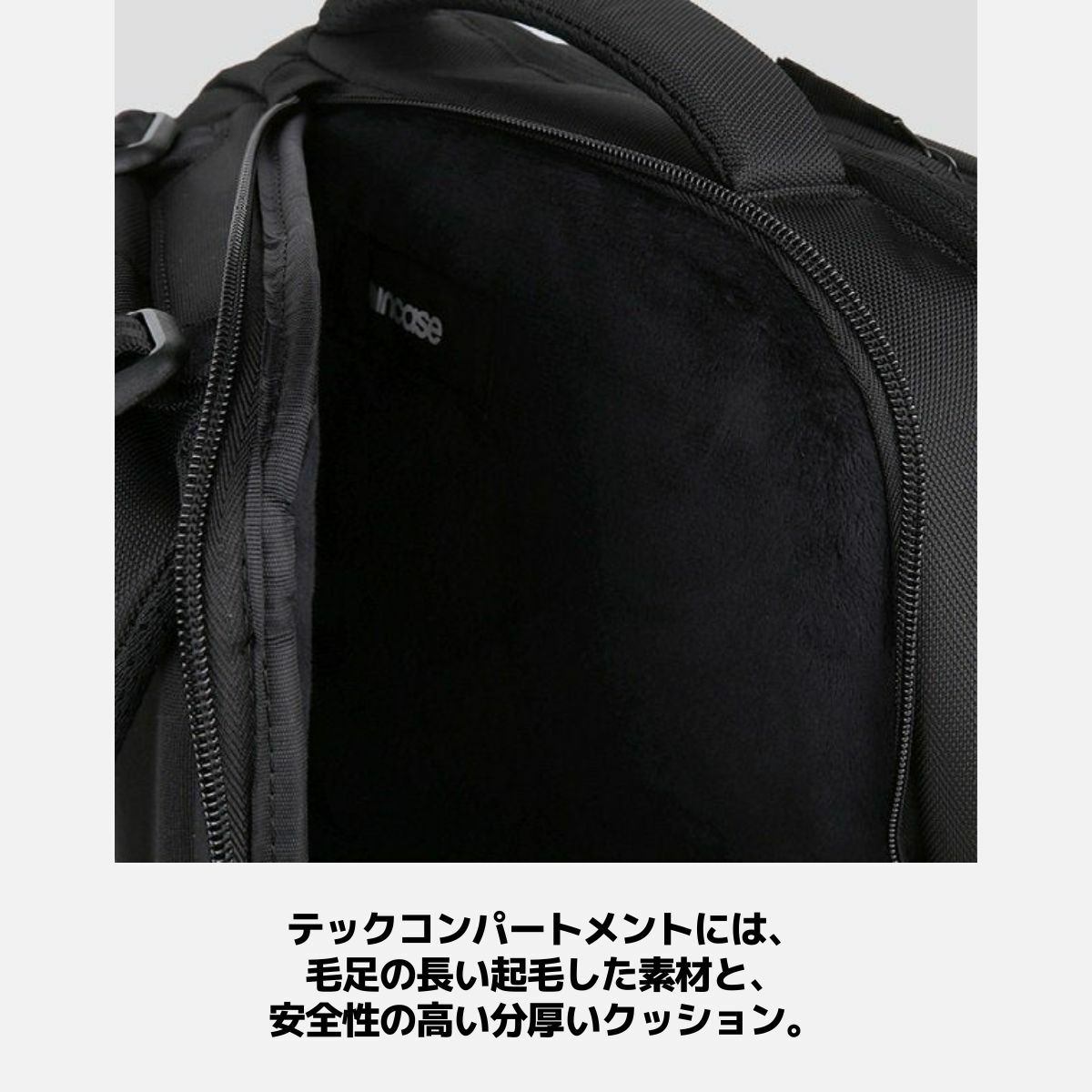 ●テックコンパートメントには、毛足の長い起毛した素材と安全性の高い分厚いクッション