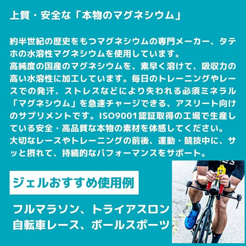ジェルと同等のエネルギー量(120kcal)とマグネシウム量(50mg)を備え、