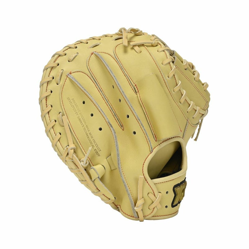 キャッチャーミットには、天巻き両サイドの穴2つずつに紐を巻かず、天巻き中央部にスリットを入れて屈曲性を表現しながら、