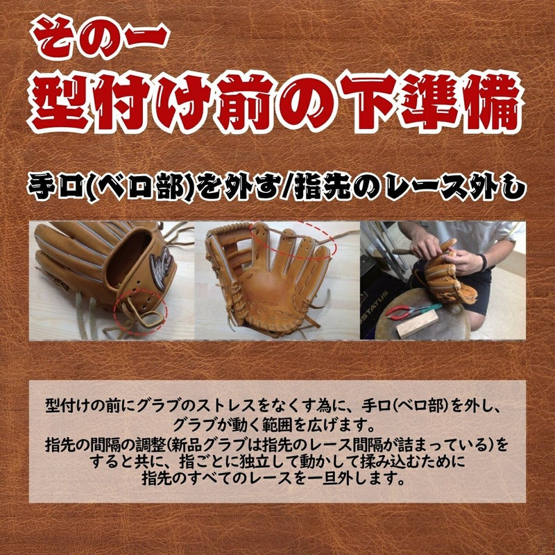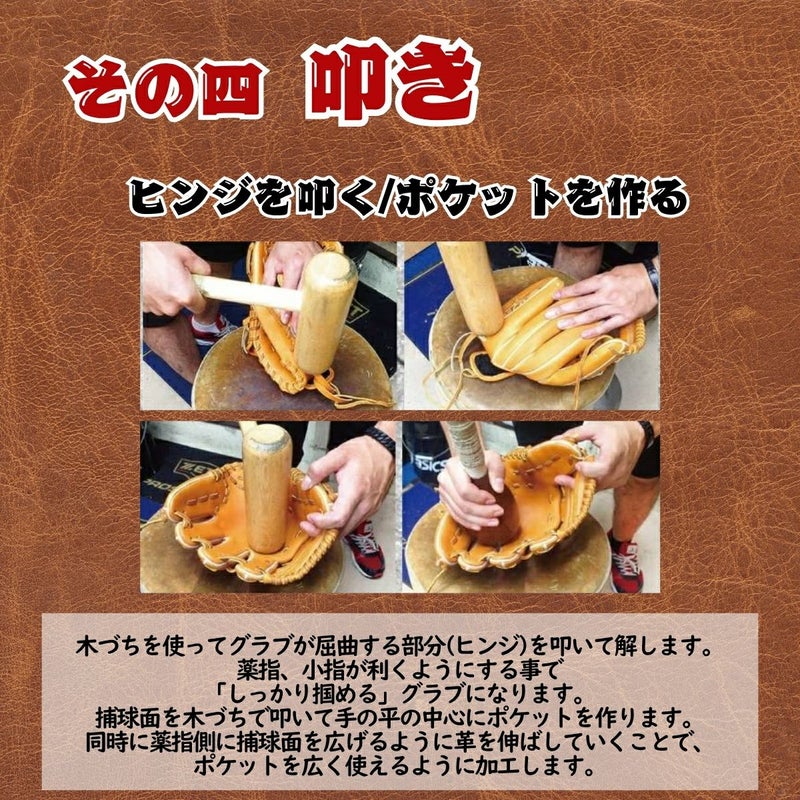 グラブを揉むことによって革を伸ばし、より柔らかく仕上げることが出来ます。