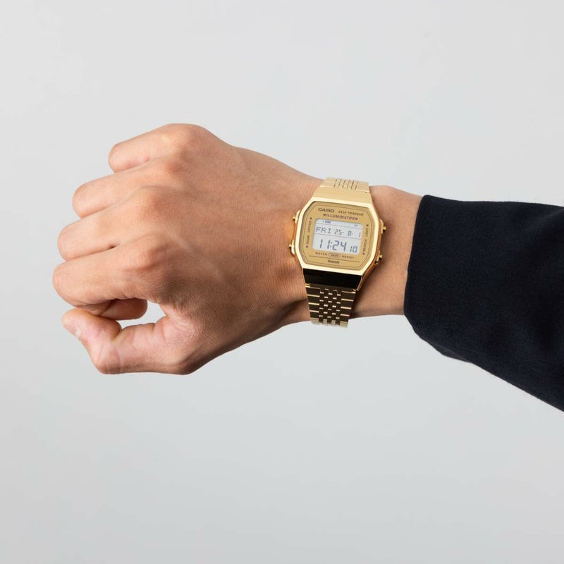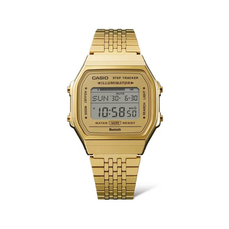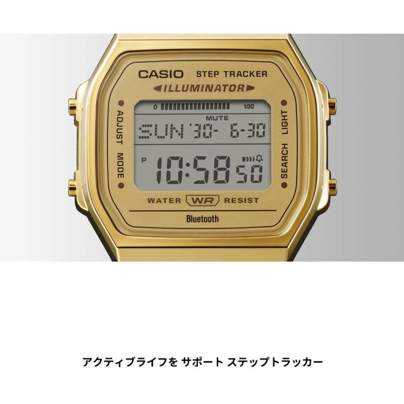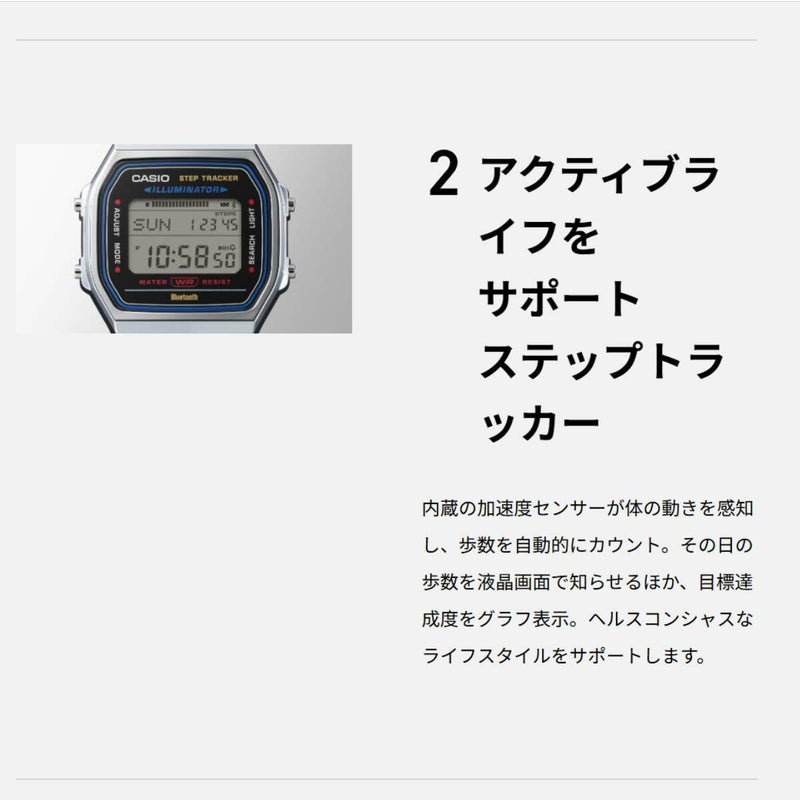 デジタル液晶のシンプルなケースに、細やかな輝きを放つ多列タイプのメタルバンドを採用し、腕馴染みのよいフラットなフォルムに仕上げました。機能面では、センサーが体の動きを感知し、歩数を自動的にカウント。その日の歩数を液晶画面でお知らせします。また、BluetoothRでスマートフォンと連携し、時計の時刻を自動修正。時計の設定をスマホのアプリ上で簡単に設定できます。さらに、時計で計測した歩数データなどをアプリに転送。ライフログとして日々の健康管理に役立てられます。