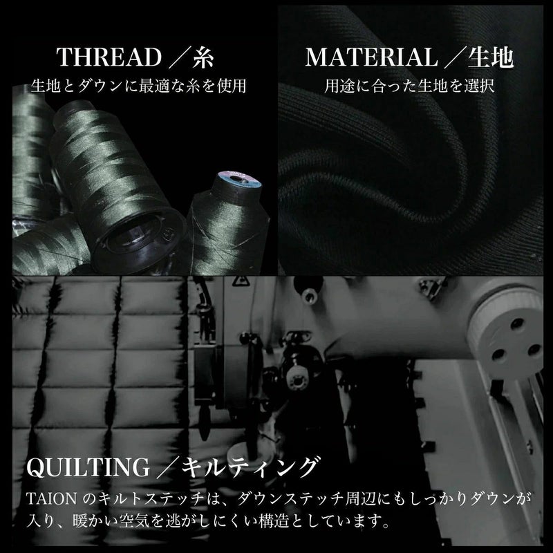 TAIONは、嵩高の高い800FPのダウン(羽毛)を採用しています。 一般で使用されるダウン(一般:600FP前後)よりも軽くて、 暖かい空気をたくさん含むことができます。