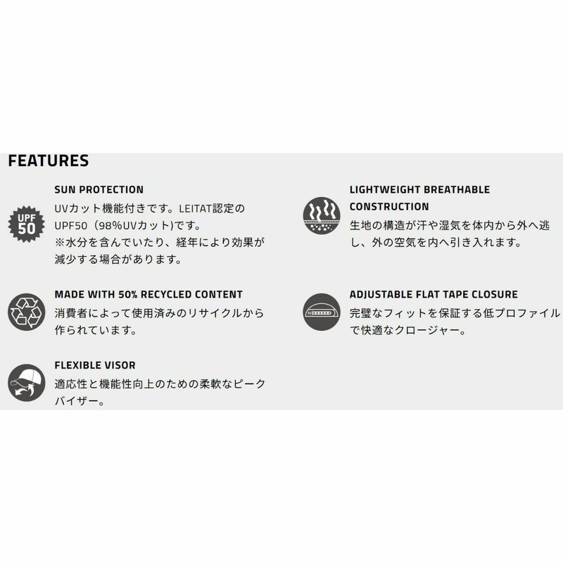 バイザーとアンダーバイザー:リサイクルポリエステル47%、ポリエステル48%、ポリウレタン5%