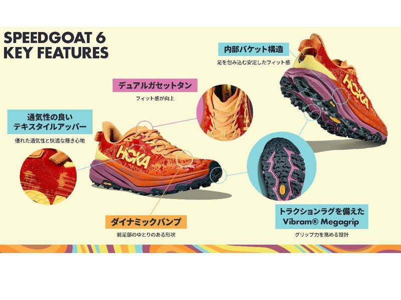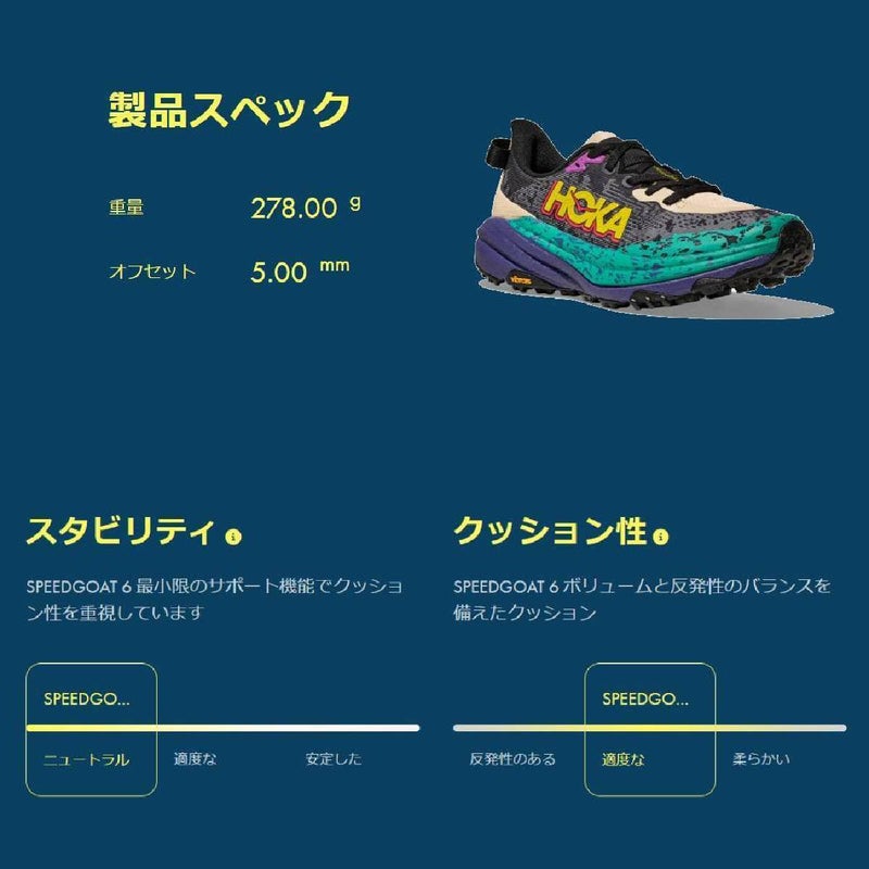HOKAの定評あるクッション性に、アグレッシブなトラクションと超軽量素材を組み合わせたSPEEDGOAT 6(スピードゴート6)。