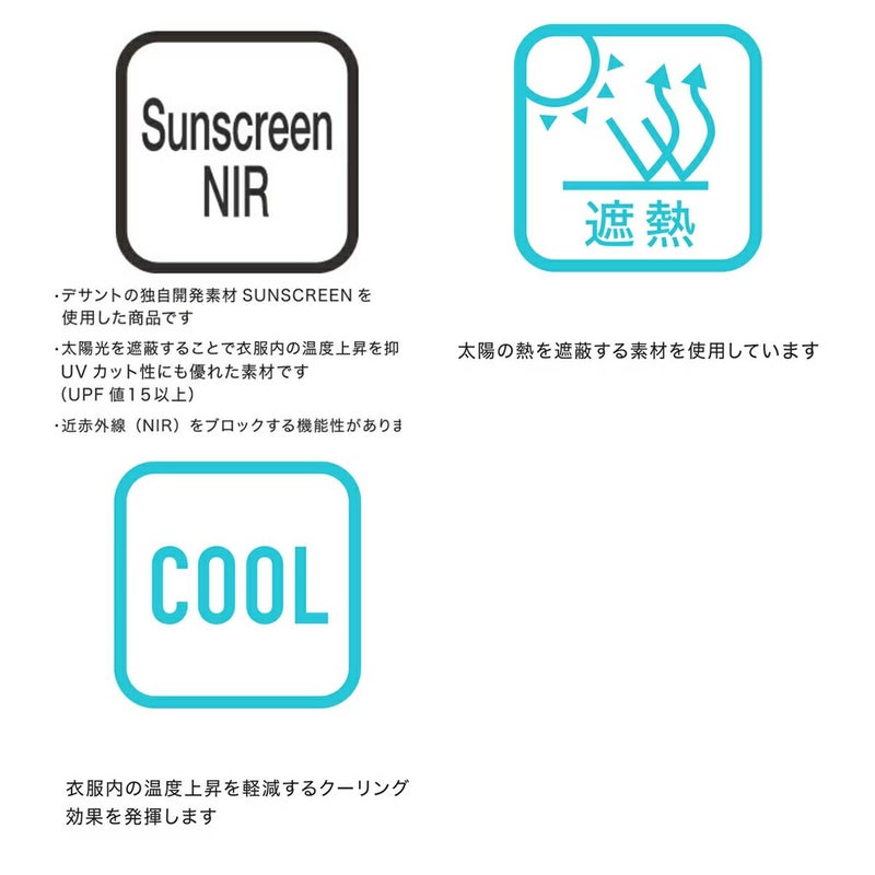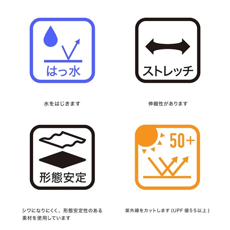 はっ水、ストレッチ、形態安定、UV CUT(UPF50+)、Sunscreen NIR、遮熱、